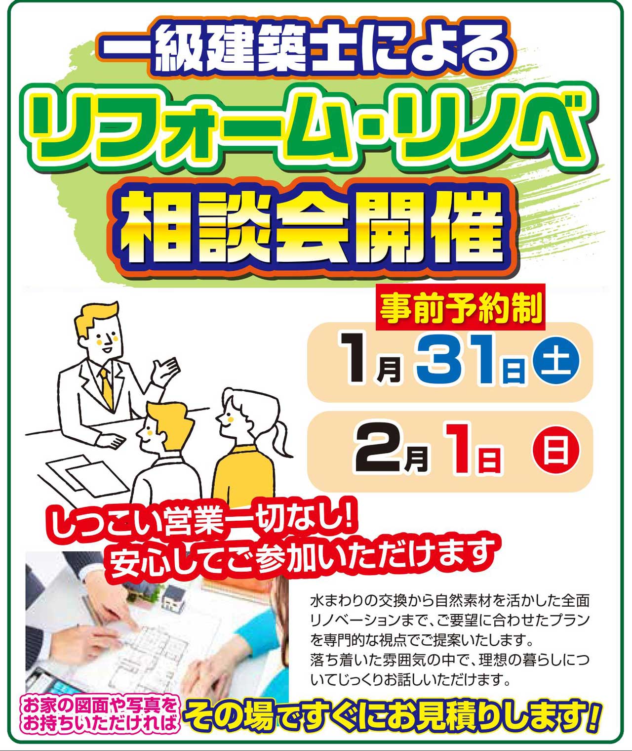安心の一級建築士に相談可能な無料リフォーム相談会は事前予約制です。