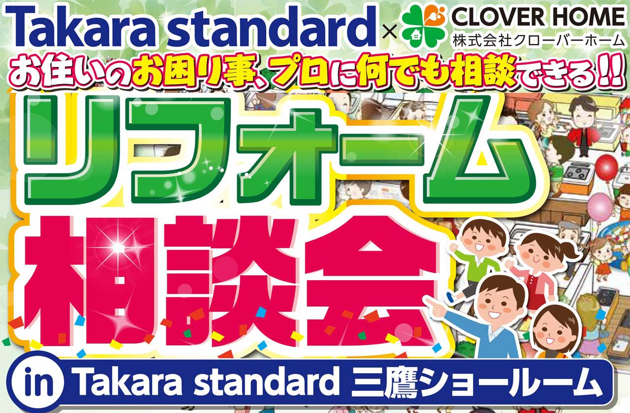 人気のタカラスタンダード様のご協力のもと、クローバーホームは住まいのお困りごとをプロに何でも相談できる相談会を開催します。東八道路沿いのTakara standard三鷹ショールーム(東京都三鷹市大沢2-7-2)で開催しますので、三鷹にお住まいの方をはじめ、近隣の武蔵野市、西東京市、小金井市、府中市などにお住まいでリフォームを考えていらっしゃる方は、是非お気軽に足をお運びください。