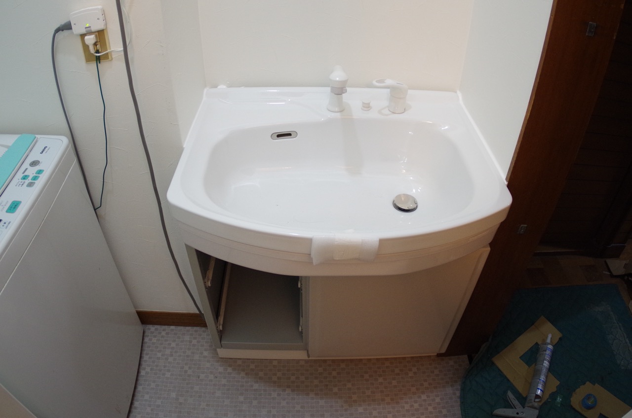 新しい洗面台の下部分が取り付けられました。あまり通路を圧迫しないよう、奥行きにはこだわりました。