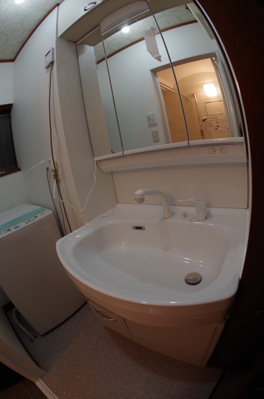 三面鏡を取り付けて、リフォームは完了です。以前の洗面台より収納が増えたので、外に置いていた小物もしまえるようになりました。このリフォームでは、壁紙(クロス)は張替えましたが、クッションフロアは新しくせず、そのまま使用することでコストダウンを図っています。