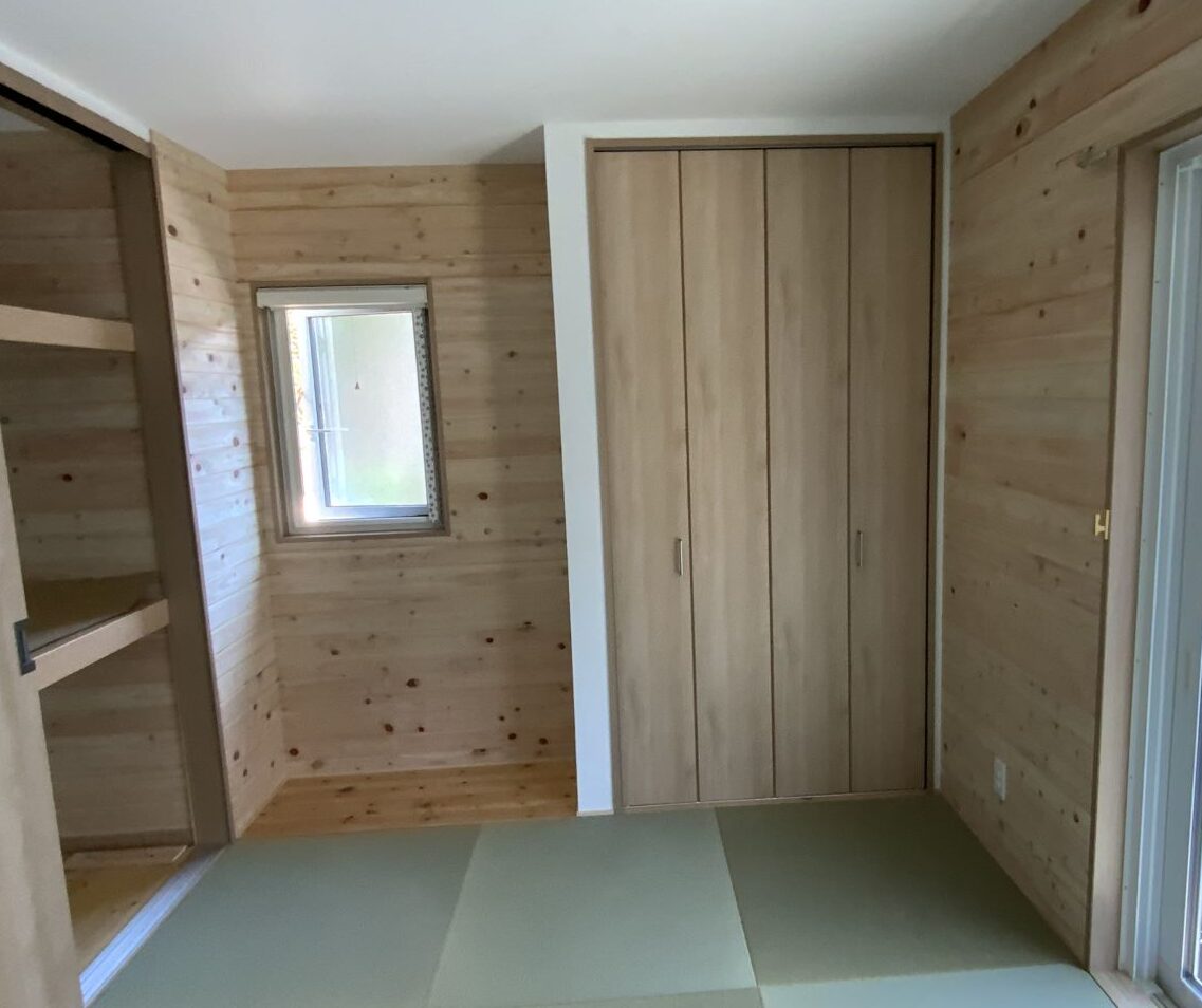 今回のリフォームでは、畳の張り替えに加え、押入れや棚、壁紙も一新しました。素材には桧(ひのき)を使用し、木のぬくもりとやさしい香りが広がる、落ち着いた温かい空間に仕上げています。桧の明るい色合いが光をやわらかく反射し、お部屋全体を自然で穏やかな雰囲気に包み込みます。